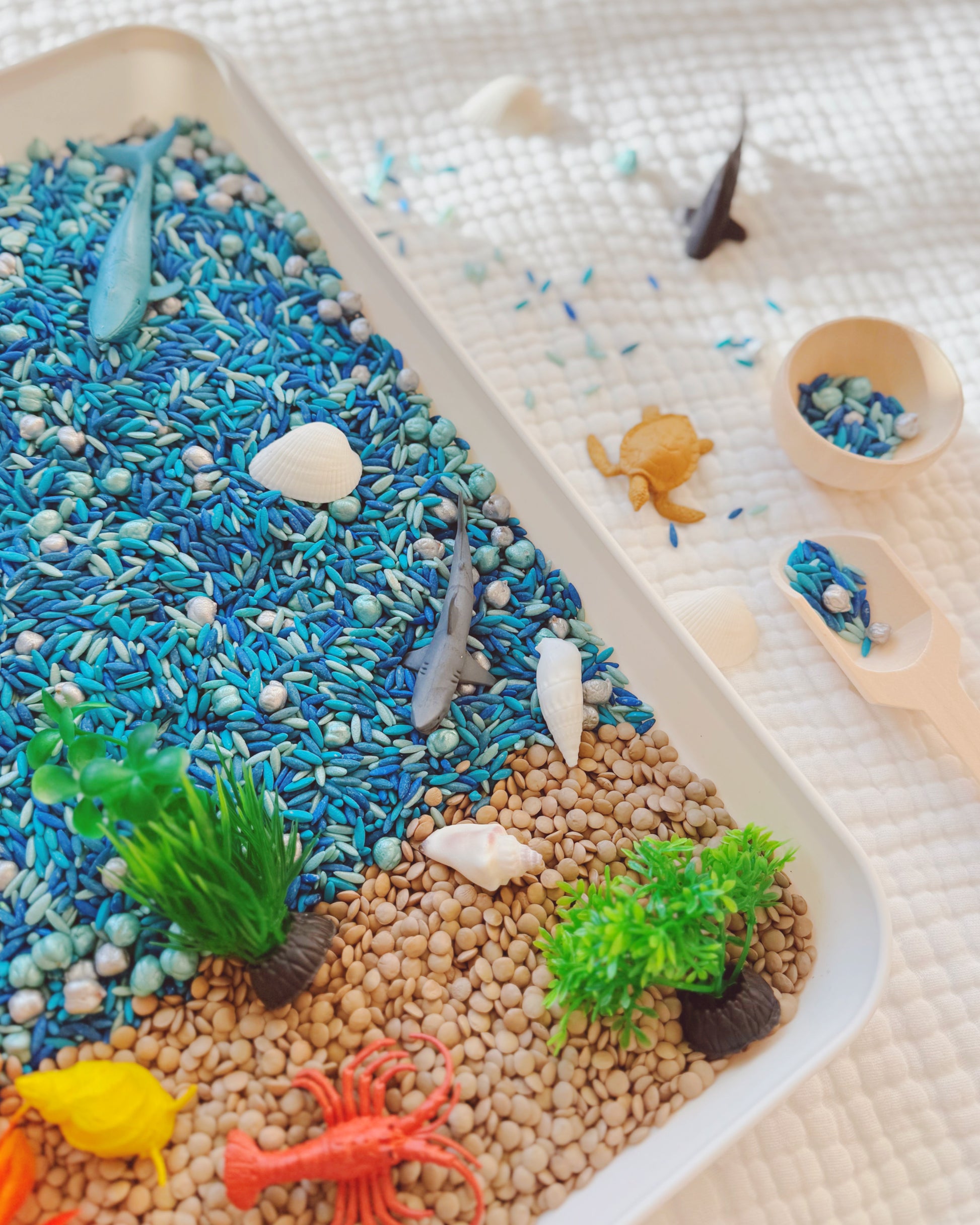 Get ready to enjoy some ocean fun! This beautiful blue sensory mix is perfect for ready-to-pour play and can be chosen in amounts of 1 cup, 3 cups, 5 cups, or 9 cups. For easy scooping in a typical IKEA Trofast bin (16”x11”x4”) or a similar size, we suggest going with the 5 or 9 cup options. Please note, the mix does not come with accessories, toys, tools, or a bin. You can add your own accessories or check out the full Oclan Explorers Play Kit in our Curated Pour & Play Collection!